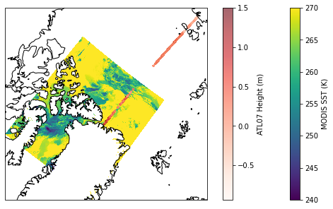 The MODIS SST is swath data, not a regularly-spaced grid of sea surface temperatures. ICESat-2 sea surface heights are irregularly spaced segments along one ground-track traced by the ATLAS instrument on-board ICESat-2. Fortunately, pyresample