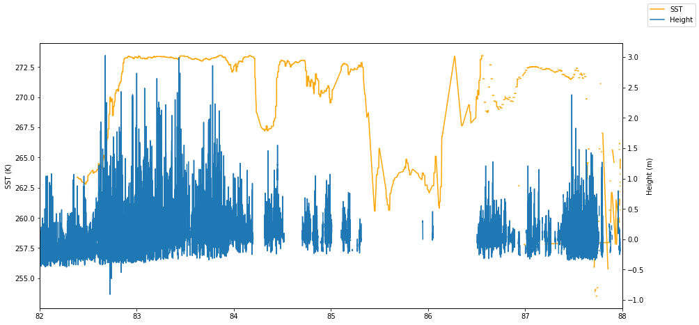 ax1.plot(is2_ds.latitude, is2_ds.sea_surface_temperature, ='orange', label='SST', zorder=3)